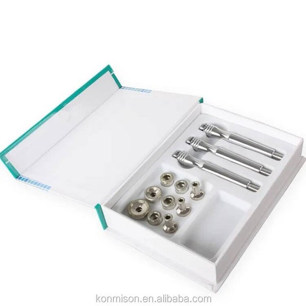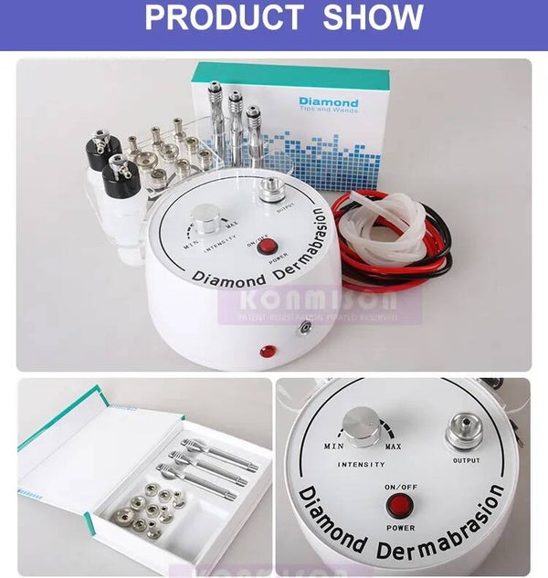 Werkend principe 1. Diamond microdermabrasie: automatische vacuümzuiging en ontgrendeling met 3 identieke bedieningshendels van roestvrij staal en 9 bedieningstips van verschillende maten en vormen voor het verwijderen van mee-eters, rimpels, acne, littekens, enz. Op verschillende gezichts- en lichaamsdelen. 2. Vacuümverwijdering van mee-eters: 3 kleine glazen kopjes van verschillende maten en vormen, speciaal ontworpen voor het verwijderen van mee-eters op de neus in combinatie met instelbare vacuümafzuiging. 3. Spray: 2 spuitflessen uitgerust voor het bevatten van water, toner of andere huidverzorgingsproducten om de opname van voedingsstoffen te verbeteren om de huid te hydrateren, op te helderen en te verjongen. Functies 1. Klein van formaat en licht van gewicht 2. Eenvoudige bediening voor dagelijkse huidverzorging; 3. 3 identieke en vervangbare diamanten handgrepen 4. 9 diamantkoppen in verschillende maten en vormen 5. 2 sproeiers voor hydratatie en verheldering van de huid 6. 3 verschillende kopjes speciaal voor het verwijderen van mee-eters